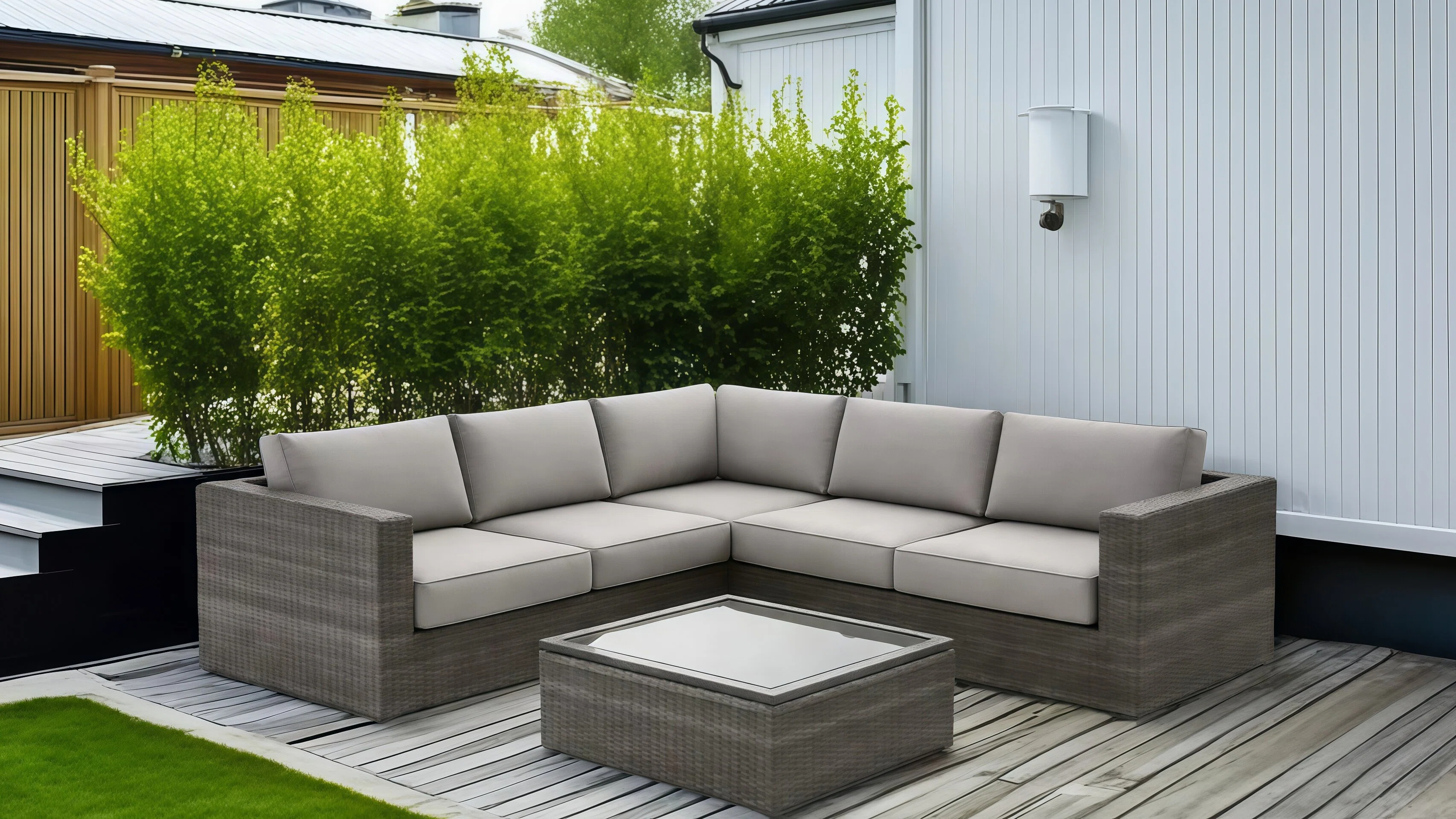 Wicker Outdoor Sectional Sofa Set with Glass Coffee Table and Grey Cushions